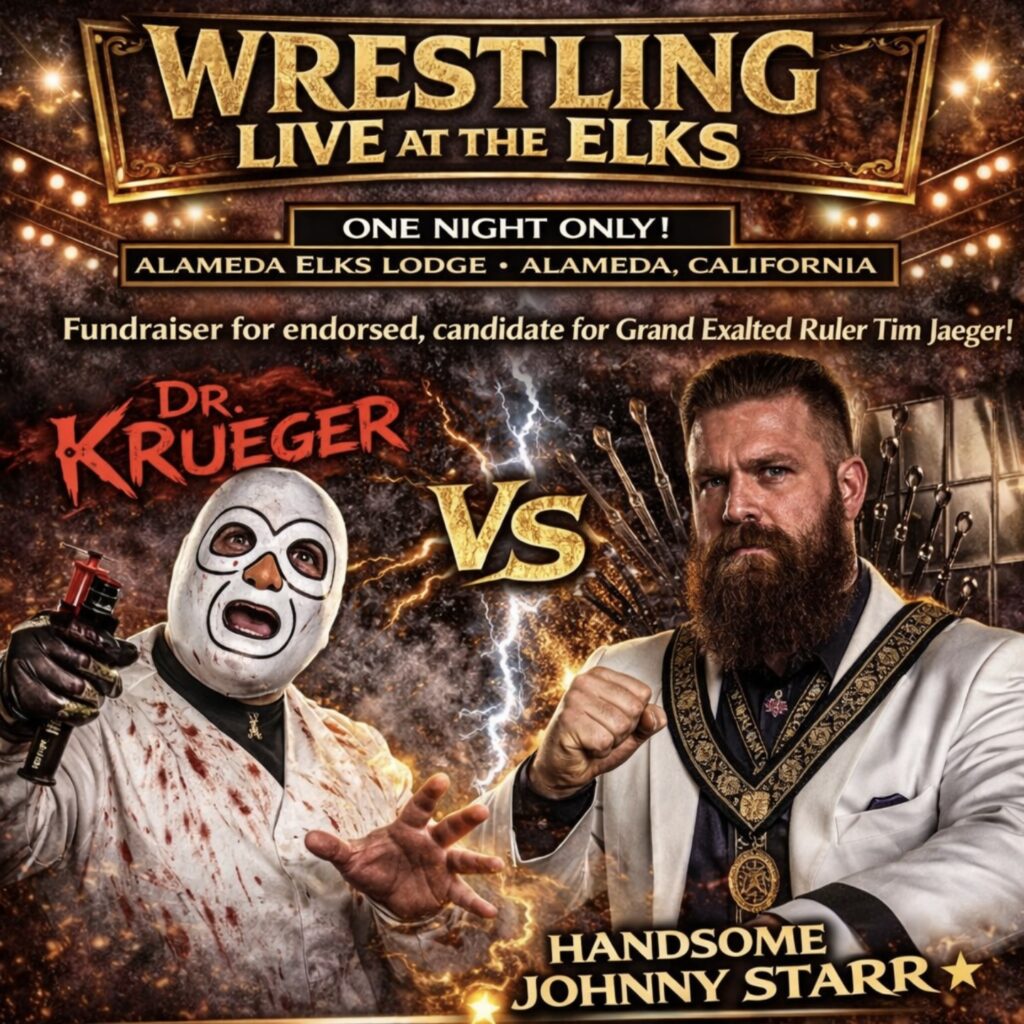 Dr. Krueger vs. Handsome Johnny Star! Join Lodge 1015’s for a fun time in the parking lot! Wrestling for our future Grand Exalted Ruler, Tim Jaeger! This event for members, …